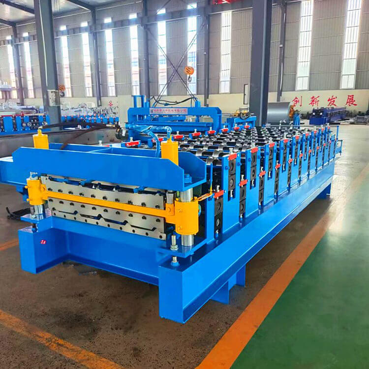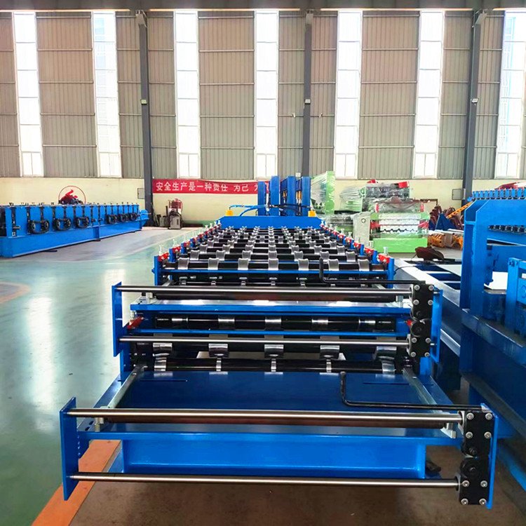 860---910雙層壓瓦機的生產是在高或低機架之間變換,生產一種輪廓的彩鋼板安裝在低機架上,生產另一種板型的軋輥安裝在高機架上面,生產線有一個開卷機,一個共用切斷剪切機,如果彩板喂入低層軋輥,成型一個板型;如料卷喂入高層的軋輥,而成型另一個斷面。此壓瓦機設備的出現,節省了設備的占地空間,特別適合場地小的彩鋼瓦生產商及安裝現場生產壓制彩鋼瓦。替換兩種不同斷面板材的生產,也提高了產出率。雙層彩鋼壓瓦機控制系統的特點;該控制系統操作簡單,是一次成型,生產流程為:開卷--前進成型--壓型--切割。雙層彩鋼壓瓦機本系統控制精度不錯,每片剪切精度小于1mm,滿足工藝要求。程序運行穩定。雙層彩鋼壓瓦機執行部分有變頻器驅動電機,液壓站電機,切刀的兩個液壓電磁閥。雙層彩鋼壓瓦機檢測部分有:檢測彩色鋼瓦長度的脈沖編碼器,壓型的上下行程開關,切刀的上下行程開關,壓型的上下操作按鈕,切刀的上下行程按鈕,急停開關,液壓啟停開關等等。